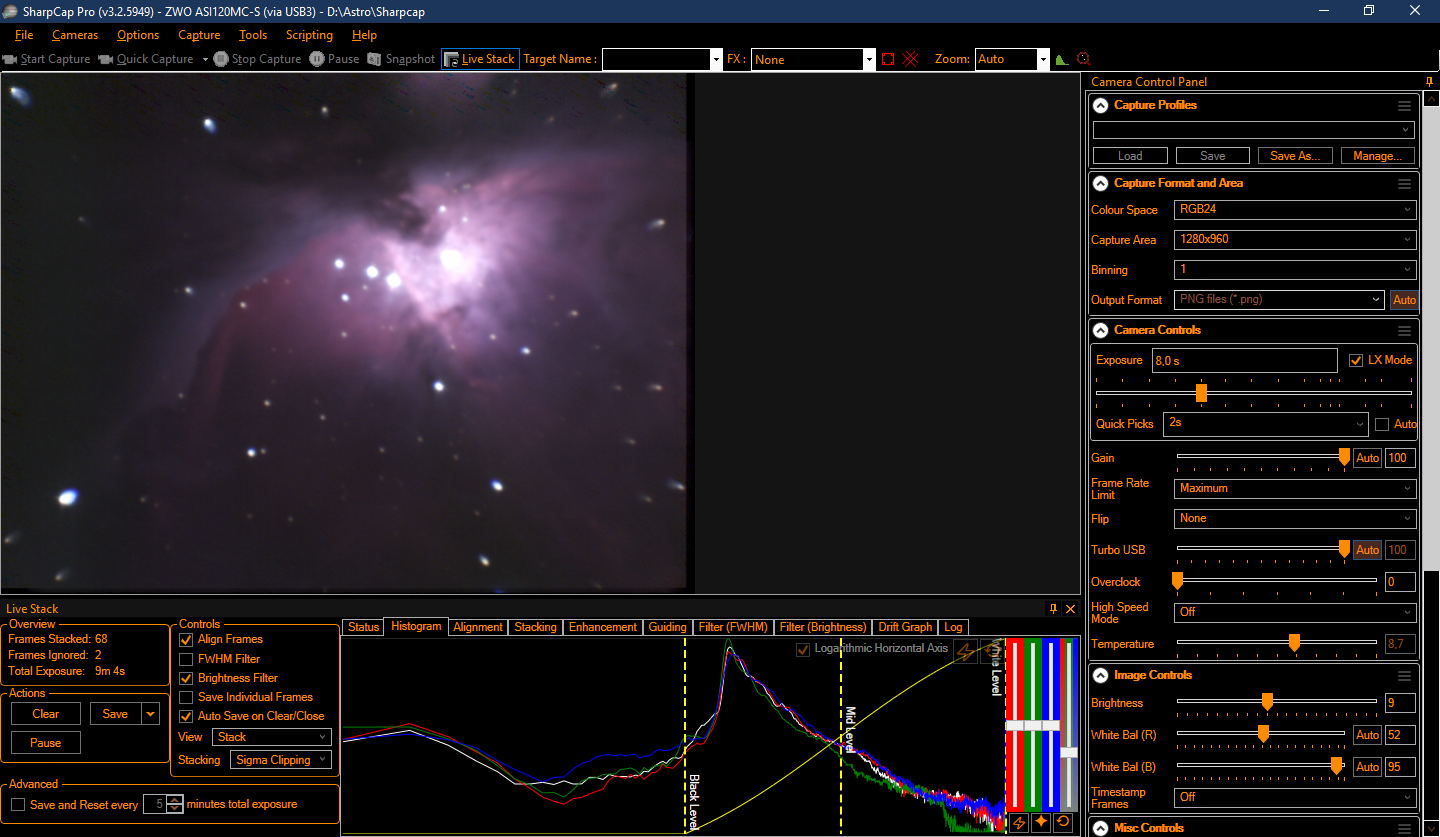 Et voilà le résultat ! 8 secondes de pose pendant 20 minutes avec un gain à 100. La grande nébuleuse d'Orion avec quelques beaux détails révélés. Pour réaliser cette photo, j'ai utilisé la fonction Live Stack de SharpCap Pro. L'idée c'est que le logiciel va aligner et empiler les photos en live. L'avantage est qu'on garde un certain contrôle sur la detection temps réel des étoiles (que l'on peut visualiser) et sur le traitement via l'histogramme.